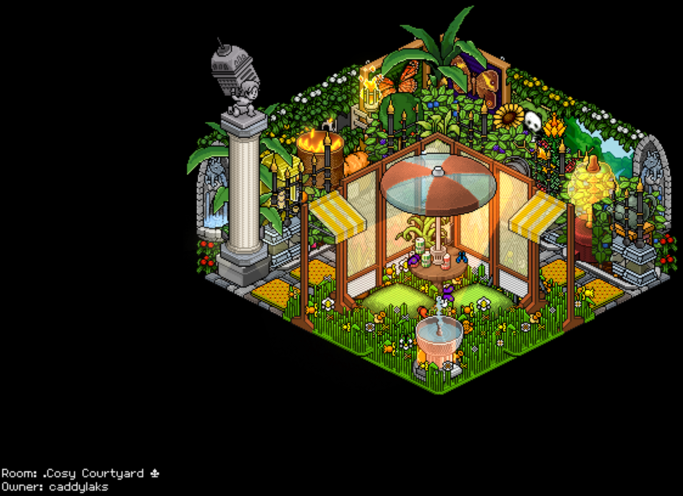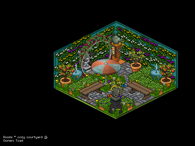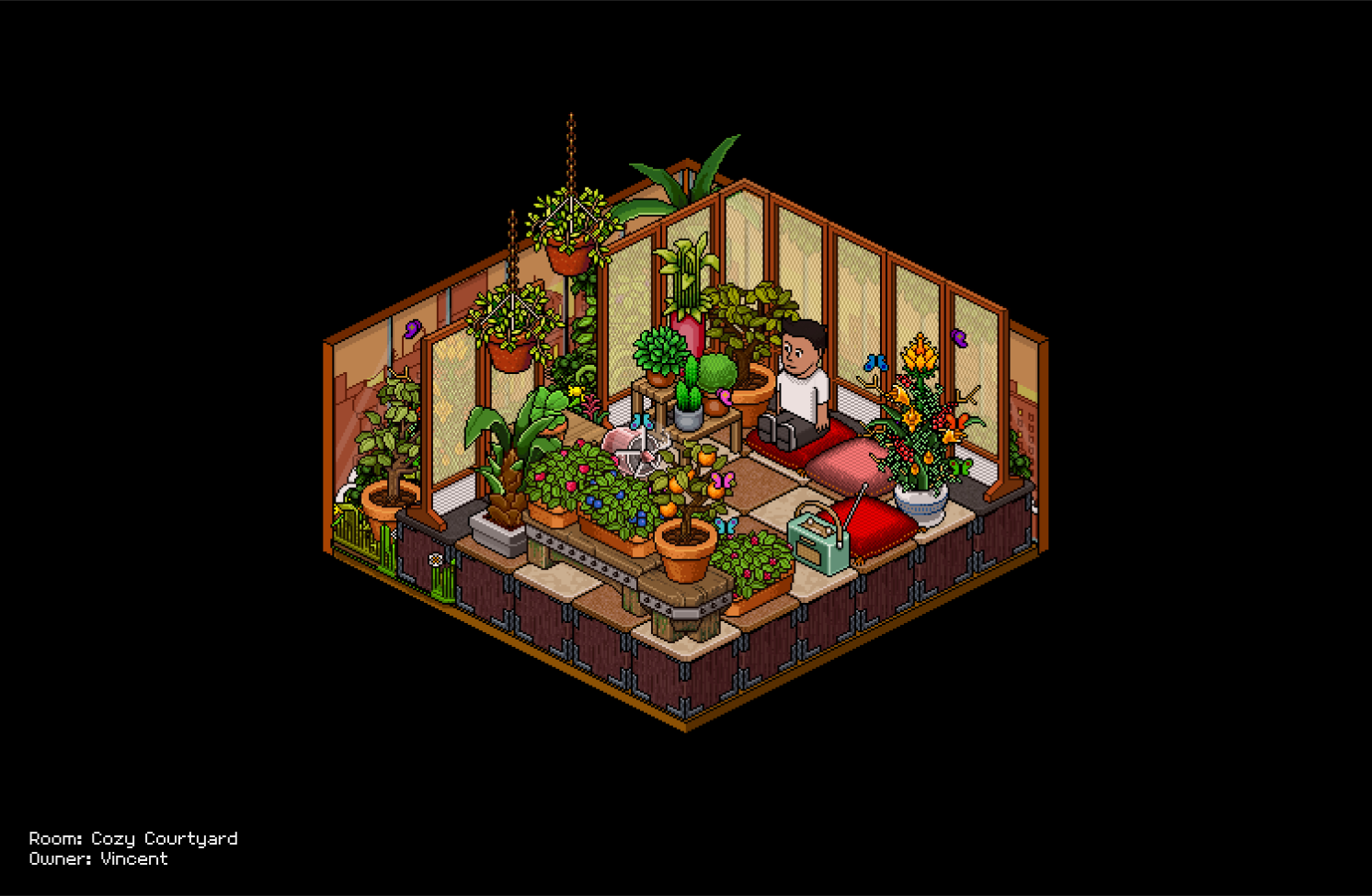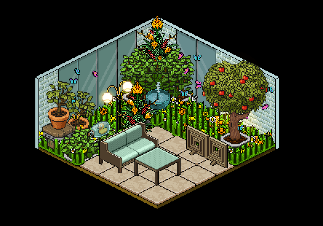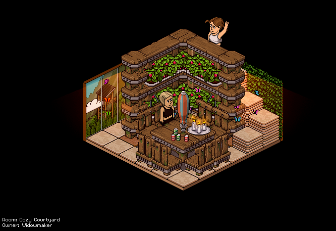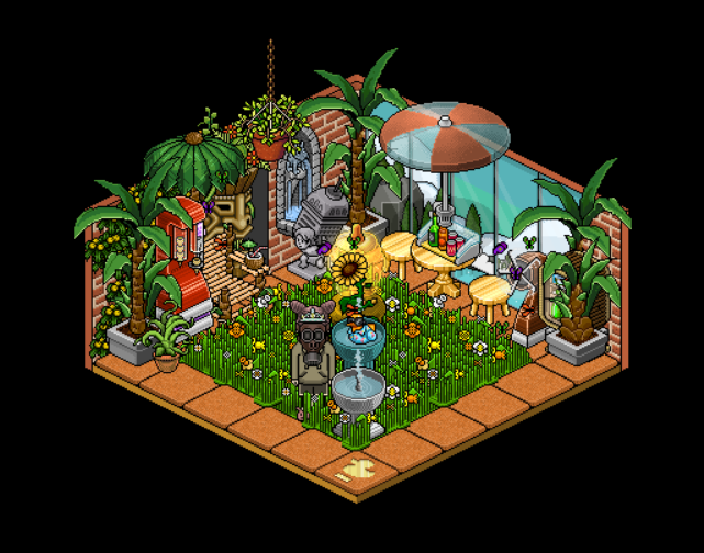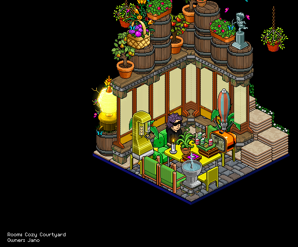 The warmth of this room almost transcends its pixel nature and seems to flow out of your computer screen - it's magical. The city skyline landscape at sunset as well as the platform of japanese drawers and Habbowood tiles makes this room look like a little rooftop courtyard. We love it.
