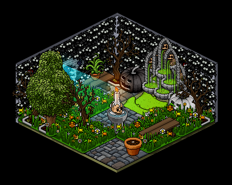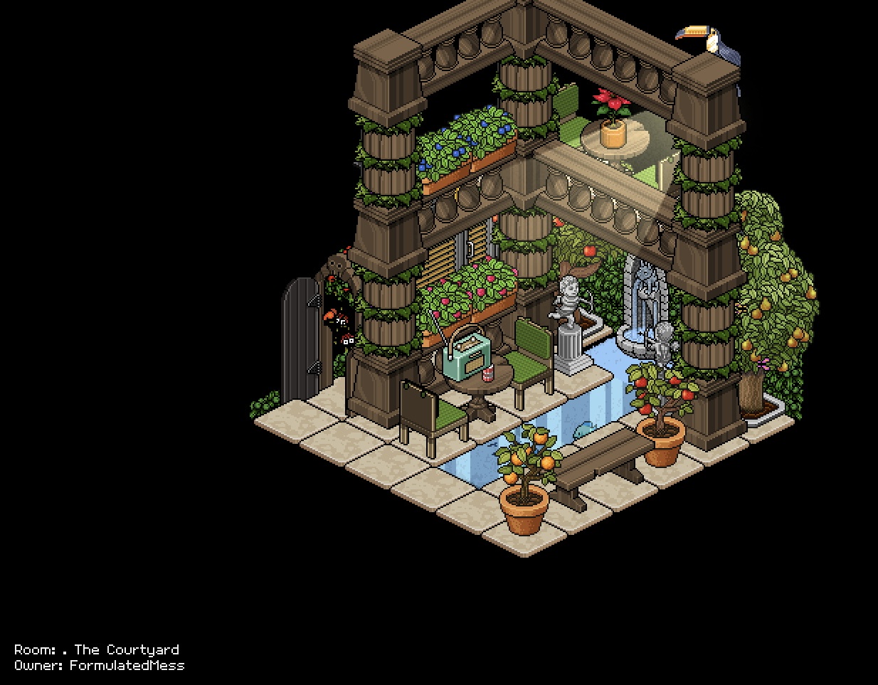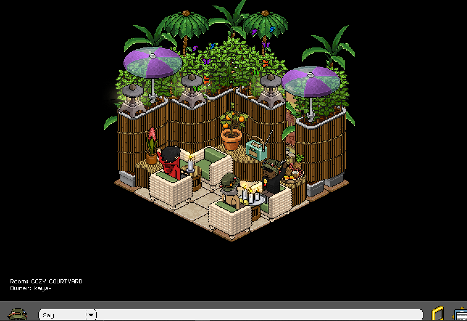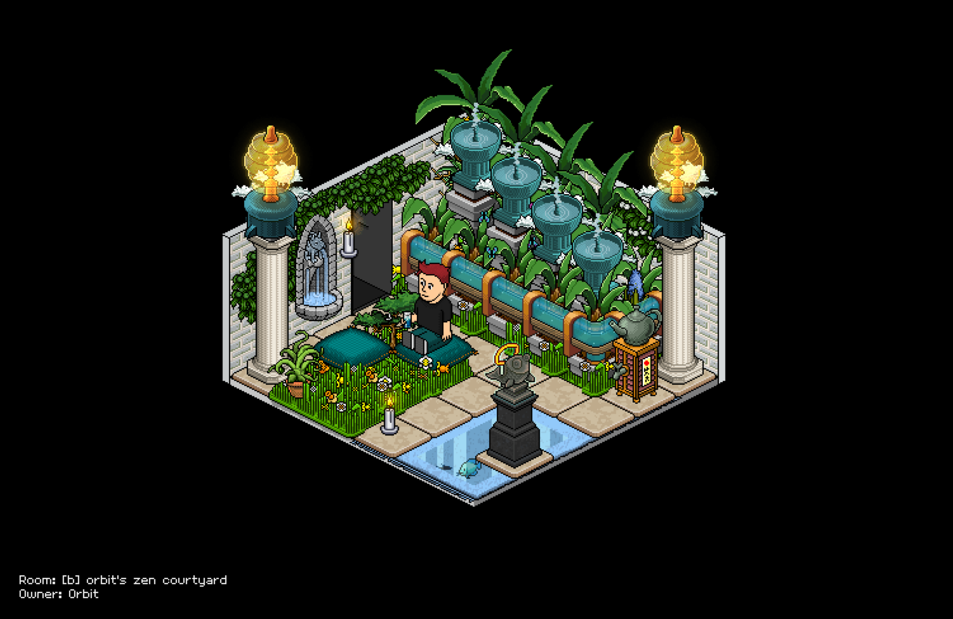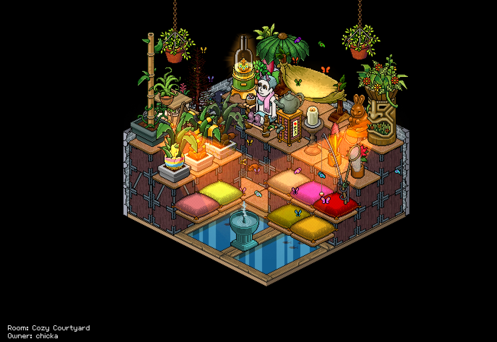 The warmth of this room almost transcends its pixel nature and seems to flow out of your computer screen - it's magical. The city skyline landscape at sunset as well as the platform of japanese drawers and Habbowood tiles makes this room look like a little rooftop courtyard. We love it.