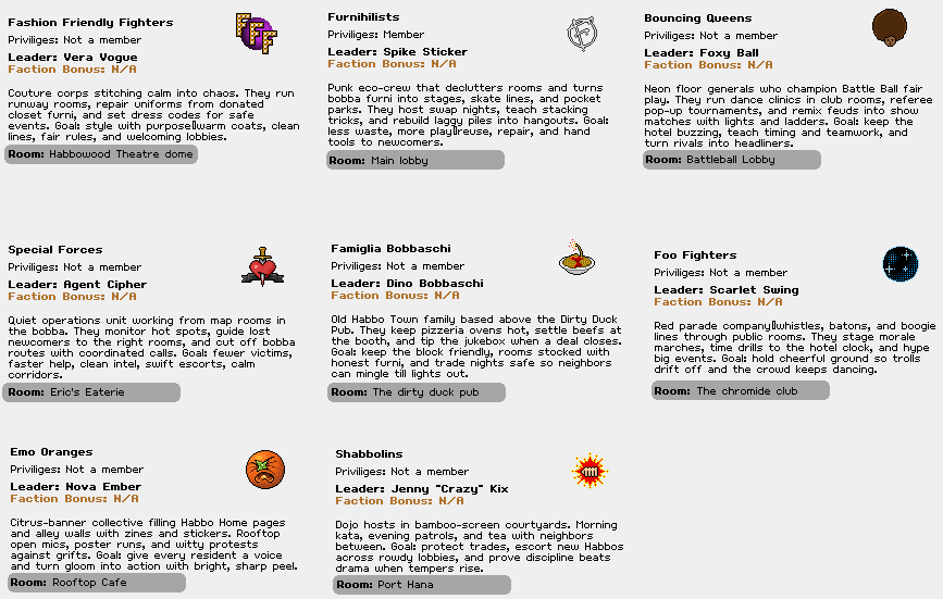 For two decades, the old factions have ruled the Streets of Bobba with an iron grip, squabbling among themselves for control over the various public rooms, wreaking havoc in the hotel. But ultimately, all things must come to an end. With the launch of Habbo Origins, a new era has begun, and now is the time for a change. New factions have formed, threatening to topple the old regime. The question on everyone’s mind is: which faction will come out on top?