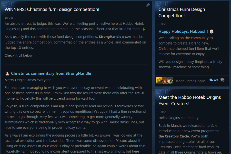 In addition to this, my request for Habbo is to have someone dedicated to responding to messages on the Steam community board and providing actual support. There are still plenty of unanswered questions that the community themselves cannot resolve, so having someone monitor and engage with these boards would be extremely helpful.
