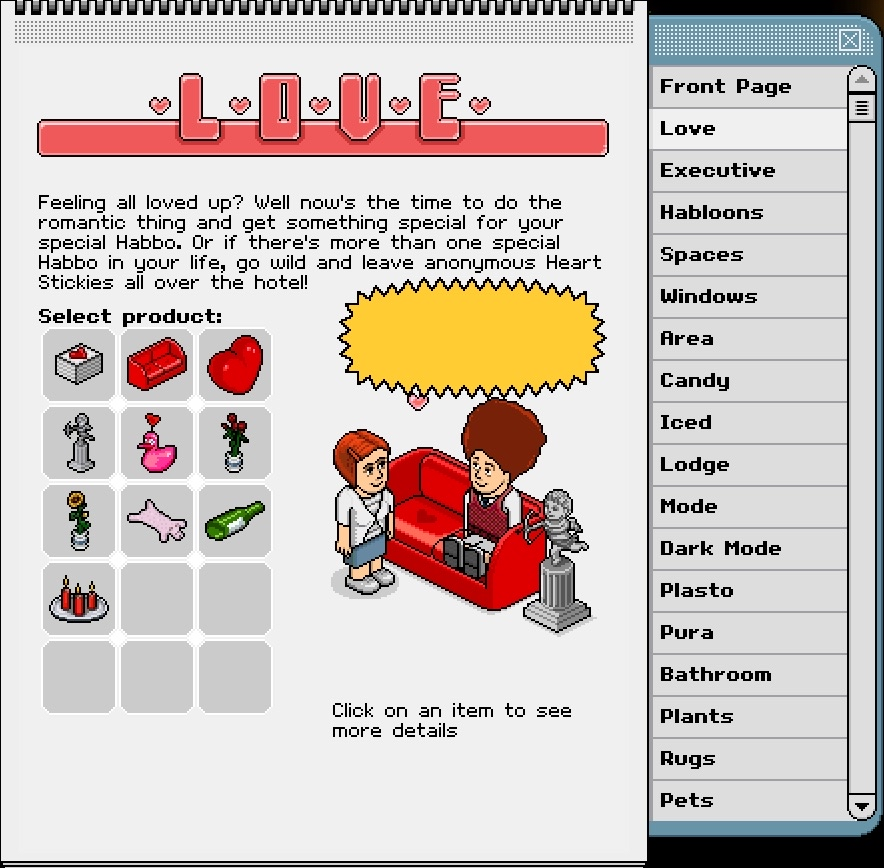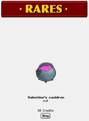 Once again, the Catalogue Rares this month were… fine, I suppose. The only item that really stood out to me was the Valentine’s cauldron. I’ve never been a big fan of oriental screens, marquees, or pillars, but with Habbo, it’s something you come to accept—those colour variations must be released at some point.